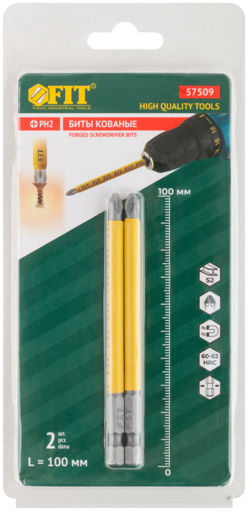 57509 Биты FIT кованые, сталь S2, односторонние 100 мм PH2, Профи 2 шт., блистер