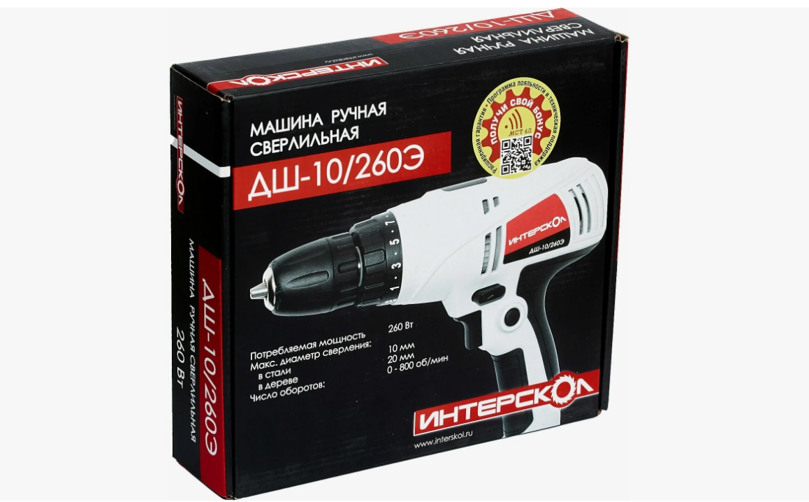 Шуруповерт Интерскол ДШ-10/260Э2 сетевой, 0-450-1800об/мин, 35Нм, БЗП 10мм, 1,4кг МС