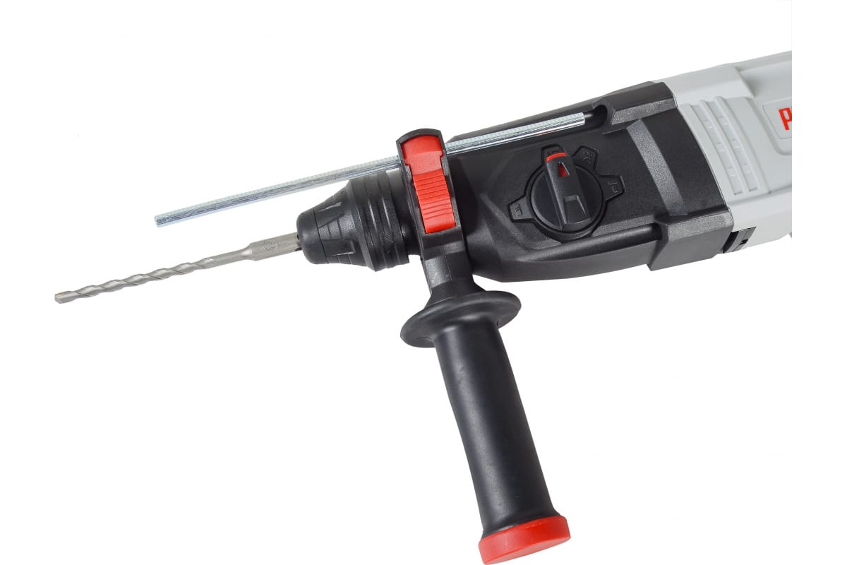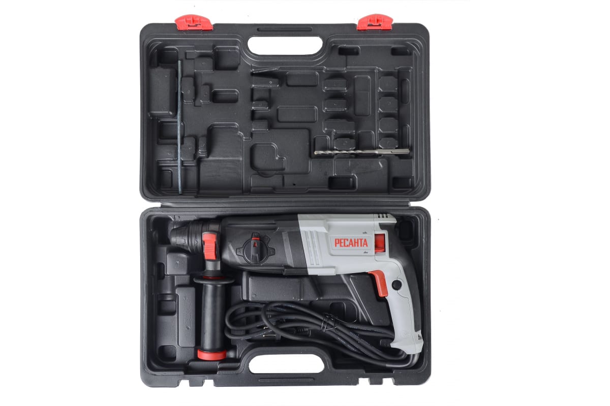 При мощности 900 Вт перфоратор обладает высокой ударной энергией 4,3 Дж и частотой ударов до 5200 уд./мин. Скорость вращения патрона в режиме сверления достигает 1100 об./мин, регулируются силой нажатия на кнопку включения. Рядом с ней расположена кнопка реверса, меняющая направление вращения на противоположное. Для установки в патрон подходят сверла, пики и буры с хвостовиком SDS-PLUS. В модели Ресанта П-30-900К установлена предохранительная муфта, она блокирует движение оснастки при заклинивании.