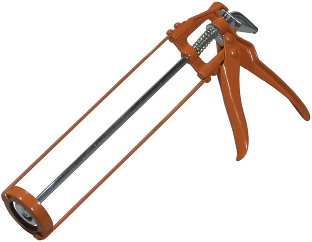 Инструмент имеет открытую конструкцию корпуса с гладким штоком. Удобная рукоятка позволяет наносить герметик точно и порционно.