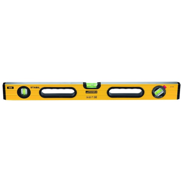 Профессиональный коробчатый уровень 100 см Stayer оснащен тремя ампулами: для измерения вертикальной поверхности, для измерения горизонтальной поверхности и одну поворотную на 180°.