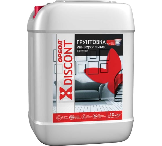 Универсальная грунтовка ОРЕОЛ Дисконт ВД 1 кг применяется для пропитки и улучшения сцепляющей способности различных поверхностей: из бетона, кирпича, асбоцемента, гипсолита, гипсокартона, пенопласта, древесины, оштукатуренных и других оснований, кроме металлических, эксплуатируемых снаружи и внутри помещений.