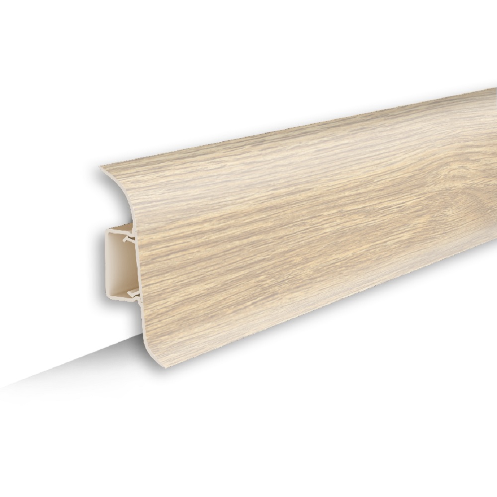 Плинтус Лексида 55 - новая модель современного дизайна с цельной лицевой частью и задним монтажным профилем, он легко монтируется за счет формы перфорации основы плинтуса.