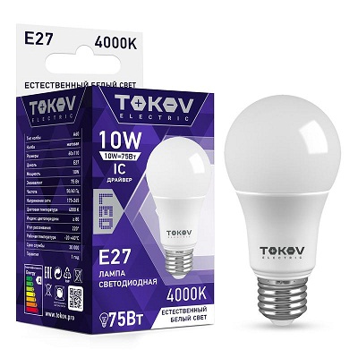 Лампа светодиодная 10Вт А60 4000К Е27 176-264В TOKOV ELECTRIC TKE-A60-E27-10-4K