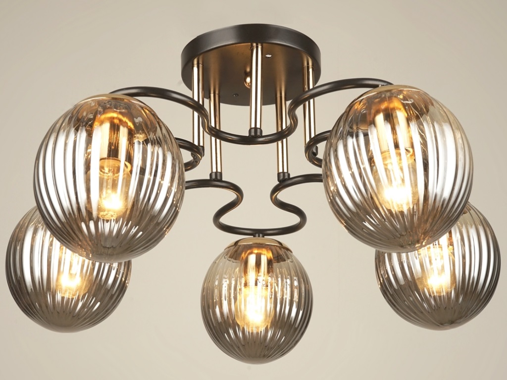 Тип изделия Потолочный Цвет каркаса Кофейный+Золотой Высота 23 см. Диаметр 53 см. Площадь освещения 10 кв.м. Цвет стекла Чёрный Допустимая мощность лампы 40 W Количество ламп 5 шт. Материал каркаса Металл Материал плафона Стекло Тип цоколя E27