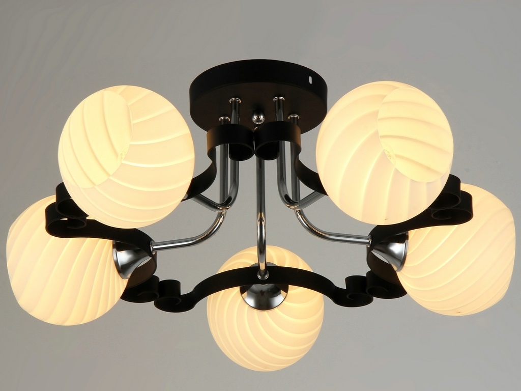 Тип изделия Потолочный Цвет каркаса Черный + Хромовый Площадь освещения 12-15 кв.м. Цвет стекла Белый Допустимая мощность лампы 40 W Количество ламп 5 шт. Материал каркаса Металл Материал плафона Стекло Тип цоколя E27