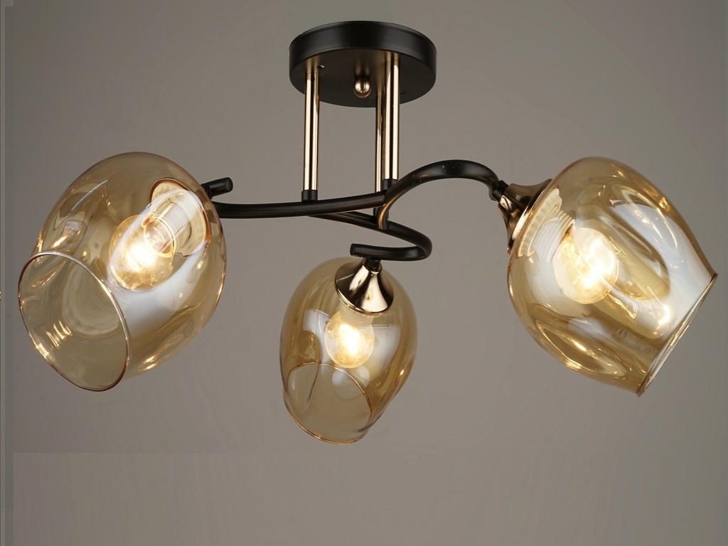 Тип изделия Потолочный Цвет каркаса Золотой+ Черный Высота 24 см. Диаметр 52 см. Площадь освещения 6 кв.м. Цвет стекла Золотой Допустимая мощность лампы 40 W Количество ламп 3 шт. Материал каркаса Металл Материал плафона Стекло Тип цоколя E27