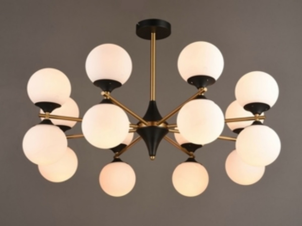 Тип изделия: Потолочный Высота: 53 см. Диаметр: 81 см. Тип цоколя: E27 Площадь освещения: 32 кв.м. Допустимая мощность лампы: 40 W Количество ламп: 16 шт. Материал каркаса: Металл Материал плафона: Стекло Цвет каркаса: Бронзовый + Черный Цвет стекла: Белый