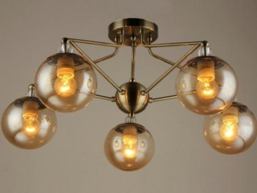 Тип изделия Люстра Цвет каркаса Бронзовый Высота 29,5 см. Диаметр 63 см. Площадь освещения 15-18 кв.м. Допустимая мощность лампы 40 W Количество ламп 5 шт. Количество штук в заводской коробке 4 шт. Материал каркаса Металл Материал плафона Стекло Тип цоколя E27