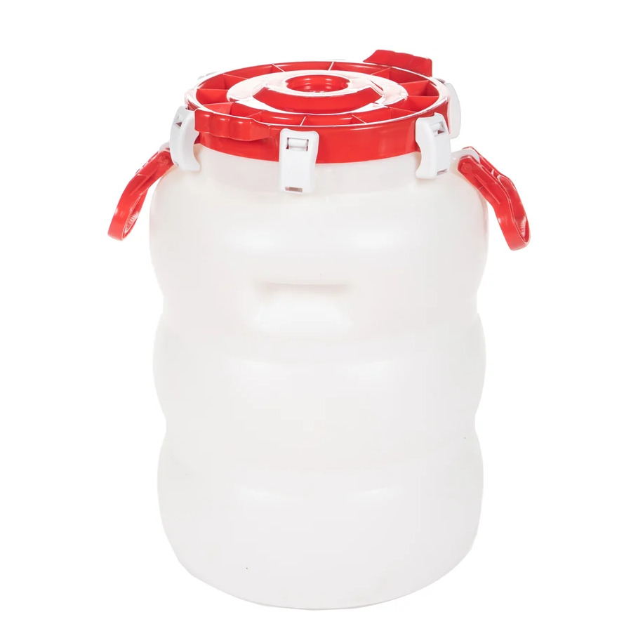 Бочка белая с крышкой, с широким горлом, с зажимом(герметичная)