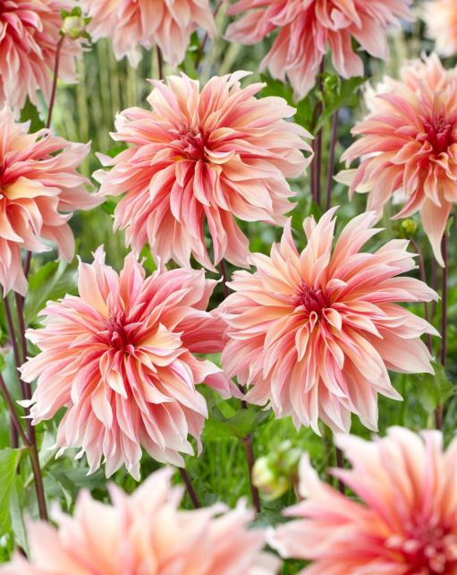 Крупные махровые цветки, достигающими 20 см в диаметре, дарят неотразимое сочетание персикового и тёмно-розового. Этот яркий и привлекающий внимание георгин достигает высоты около 90 см, что делает его идеальным цветком для центральной или задней части бордюра. Все георгины из серии "гигантских" великолепно смотрятся в букетах благодаря крупным цветкам и длинным крепким стеблям.