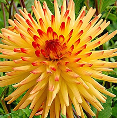 Георгины кактусовые «Спассмахер», 1 шт. - интересная группа с оригинальными цветками. Лепестки скручены в трубочки с острым кончиком, словно колючки кактуса. Высота растения 120 см, диаметр цветка 14 см. Цветение обильное. Могут выращиваться в открытом грунте и в горшках. Цветок желтый с красными кончиками.