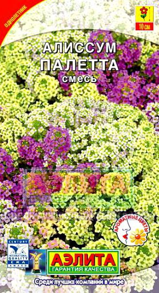 Полноцветная смесь неприхотливого летника, включает четыре расцветки. Формирует симпатичные, ровные, низкорослые (10 см) кустики. Мелкие цветки, собранные в плотные кистевидные соцветия, источают сильный медовый аромат. Славится высокой декоративностью, которая отмечена официальной наградой – медалью качества европейской организации производителей семян. Алиссум неприхотливый, не требовательный к почвам, холодостойкий, предпочитает солнечные места. Идеально подход ально подходит для окантовки клумб и рабаток, используется на каменистых горках.