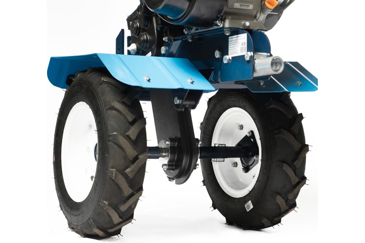 Мотоблок поставляется с комплектом транспортных колёс и дополнительными фрезами для культивации. Одновременно на мотоблок можно установить 6 фрез, которые идут в комплекте. Это обеспечивает широкий захват и устойчивую работу мотоблока на обработанной почве, а также увеличивает производительность.
