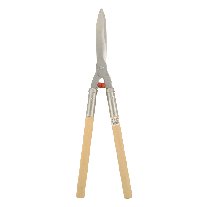 Ножницы садовые, кустарниковые, бордюрные. Предназначен для формирования кроны деревьев и кустарников и рассчитан на работу с ветвями для подравнивания живой изгороди. Волнистые лезвия дополнительно удерживают ветку во время работы. Упорный амортизатор служит ограничителем хода сжатия, одновременно смягчая остановку инструмента и предохраняя его от излома. Лезвия изготовлены из стали и остро заточены. Деревянные рукоятки защищены от рассыхания бесцветным лаком.