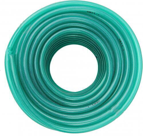 3-х слойный садовый шланг для бытового применения, внешний слой прозрачного зеленого цвета, плетеное текстильное армирование, внутренний слой прозрачного зеленого цвета. Изготовлен из первичного сырья.