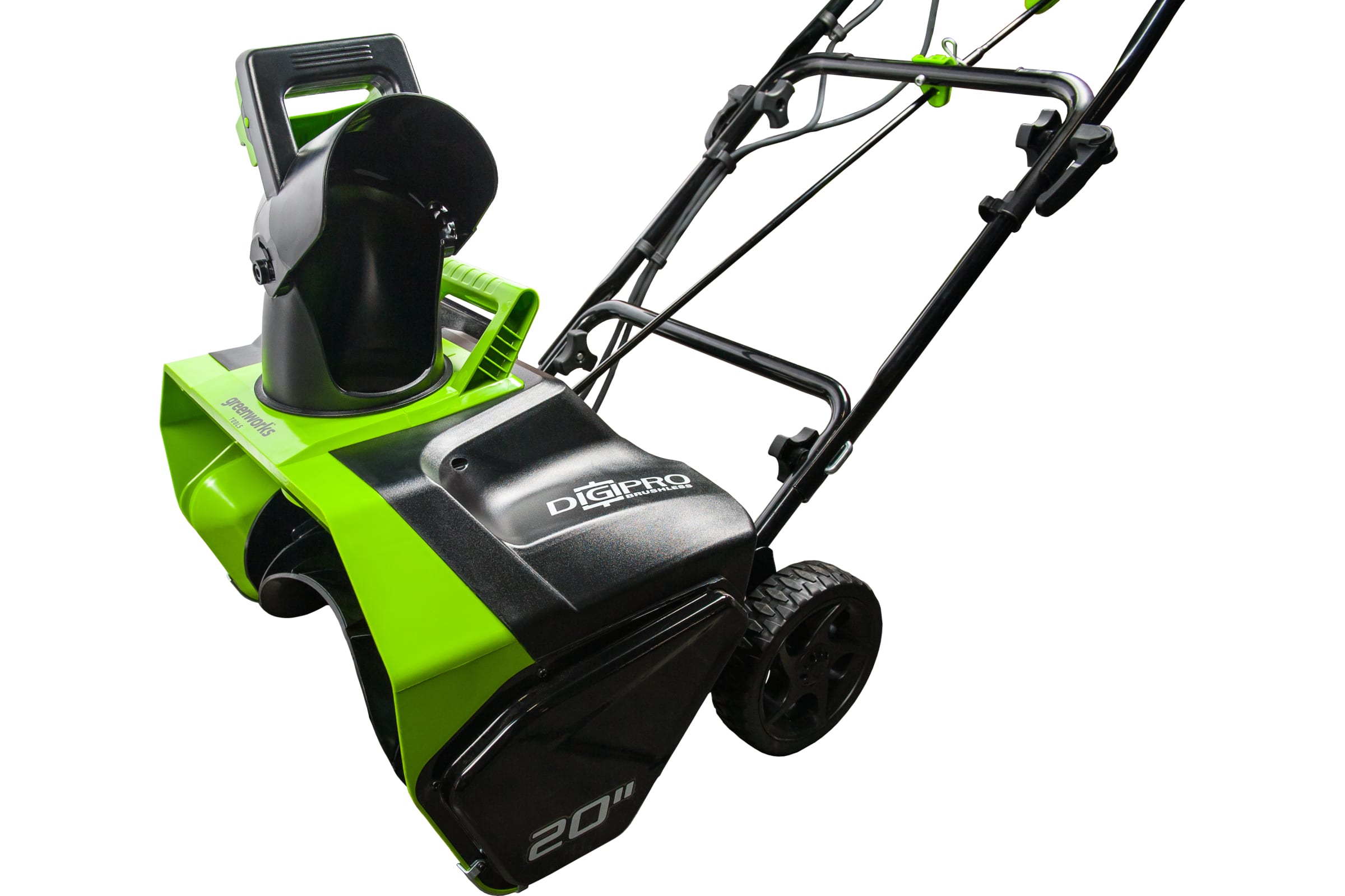 Преимущества модели: Бесщёточный двигатель DigiPro™; Снегоуборочный шнек из армированного пластика, не повреждающий декоративные покрытия; Малый вес; Большие колеса диаметром 17 см для удобства перемещения; Не требует времени для подготовки к работе, включение нажатием одной кнопки; Регулировка угла (190°) и дальности выброса снега (до 6 метров); Фонарь с 3 светодиодами; Кнопка-предохранитель от случайного включения; Устройство работает от аккумуляторной батареи, совместимой с 50+ моделями инновационного садового инструмента платформы Greenworks 40V;