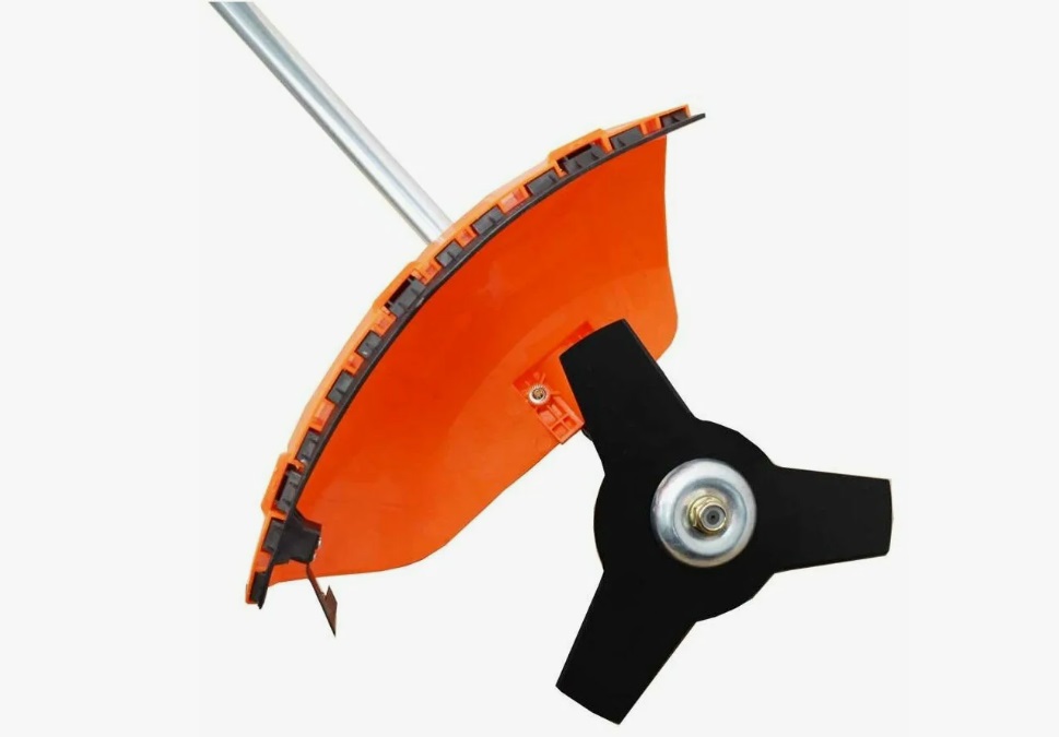 Универсальный защитный кожух можно использовать с ножом - косой для жестких зарослей, фрезой из упрочненной углеродисто углеродистой стали для кустарника и тонких деревьев или кордовой головкой для травы.