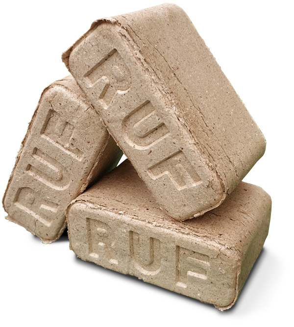 Брикеты RUF изготавливаются из сухой спичечной соломки и стружки на гидравлическом прессе производства немецкой фирмы «RUF». Сдавливание материала в прессе происходит за счет гидравлического усилия. Брикеты RUF также не содержат связующих добавок. Выпускаемые брикеты имеют форму кирпичиков с размером граней 15x6x9 см и упаковываются в прозрачную пленку по 12 штук. Вес упаковки 10 кг, размеры 40х19х15.5 см.