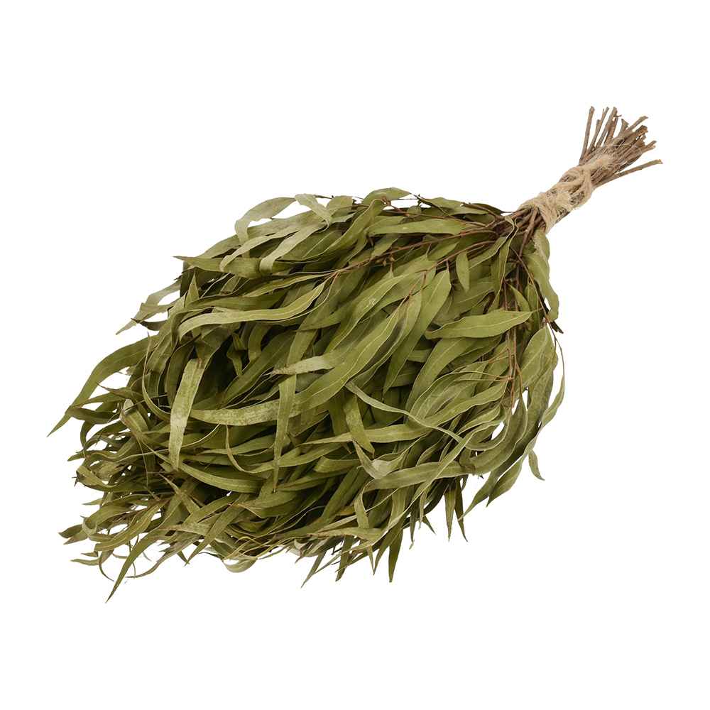 Эвкалиптовый веник обладает характерным ароматом. Он обеззараживает помещение, обладает мощным противомикробным действием, эффективен для профилактики простудных заболеваний. Размер: 48-53 см.