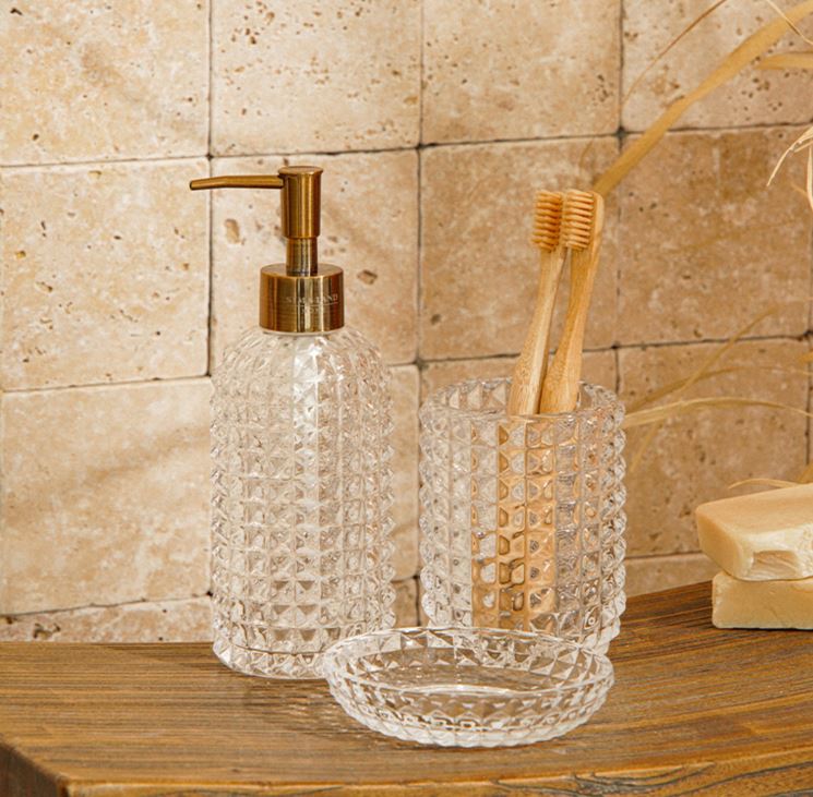 Изготовленные из прозрачного стекла, аксессуары в этом наборе обладают не только эстетической привлекательностью, но и надёжностью. Они легко вписываются в любой интерьер благодаря своей однотонной текстуре, позв кстуре, позволяя акцентировать внимание на других деталях вашего дизайна.