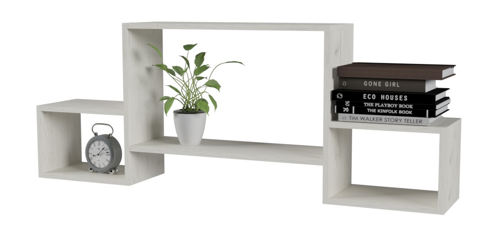 Удобное расположение полочек способствует рациональному размещению книг на большей площади в середине и декоративных предметов в малых квадратах по краям.