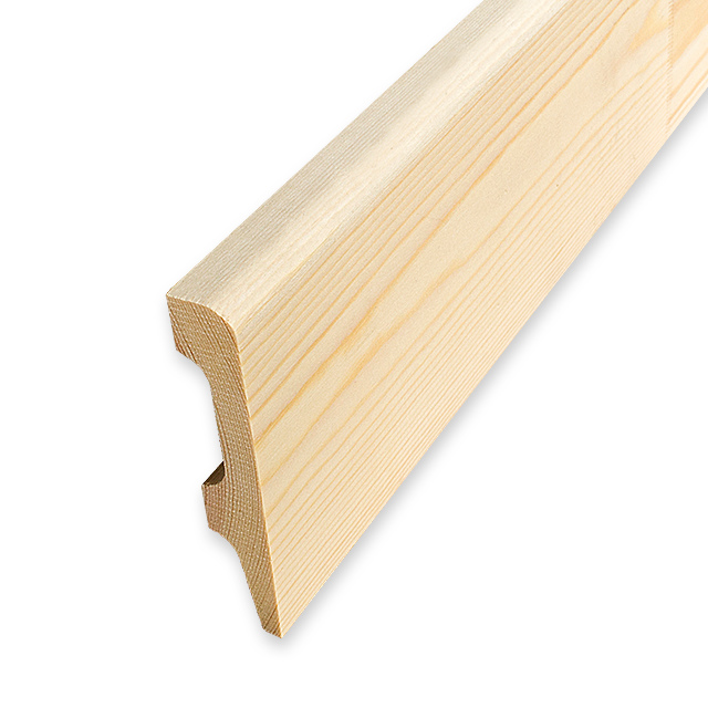 Плинтус широкий «евро» предназначен для внутренней отделки помещений, а именно для закрытия зазоров между полом и стеной до 16 мм. Придает интерьеру законченный вид. Плинтус производится из натурального экологичного сырья — массива российской сосны. Для изготовления используется бессучковой материал с высокими эстетическими качествами. Сосна устойчива к деформации, растрескиванию и гниению. Для крепления элементов рекомендуется использовать финишные гвозди.