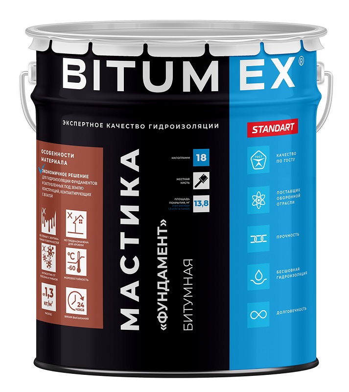 BITUMEX мастика битумная «Фундамент» представляет собой полностью готовый к применению материал на основе изоляционного битума, содержащий технологические добавки, минеральные наполнители и органический растворитель.