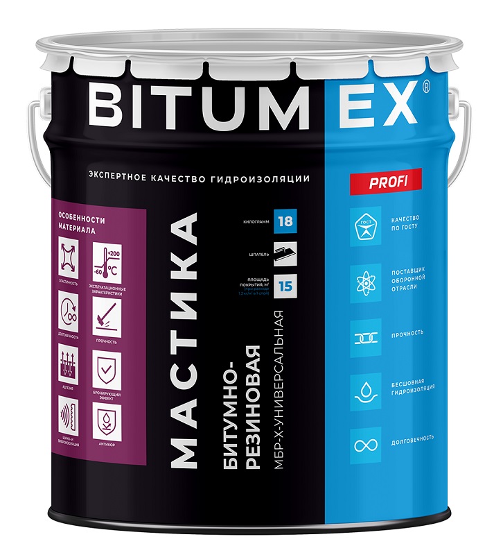 BITUMEX мастика битумно-резиновая МБР-Х-Универсальная представляет собой полностью готовый к применению материал на основе высококачественного модифицированного мелкодисперсной резиной битума, содержащий технологические добавки, минеральные наполнители, модифицирующие добавки и органический растворитель.