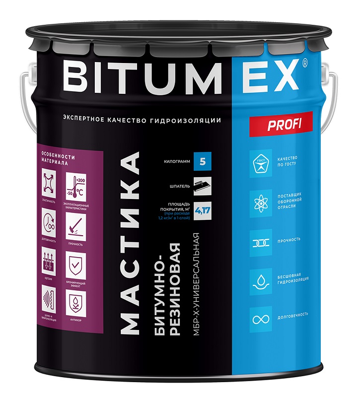 BITUMEX мастика битумно-резиновая МБР-Х-Универсальная представляет собой полностью готовый к применению материал на основе высококачественного модифицированного мелкодисперсной резиной битума, содержащий технологические добавки, минеральные наполнители, модифицирующие добавки и органический растворитель.