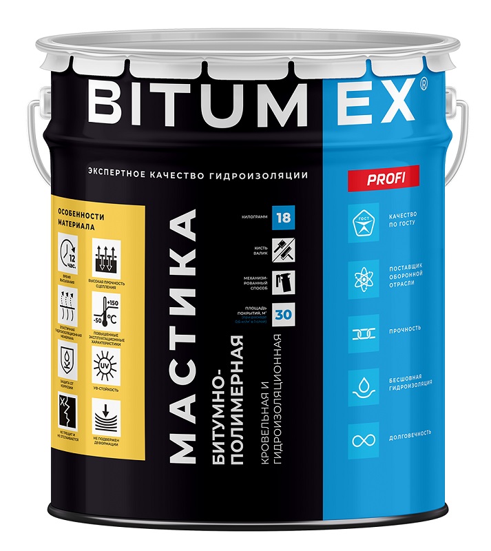 BITUMEX мастика битумно-полимерная кровельная и гидроизоляционная представляет собой полностью готовый к применению материал на основе высококачественного модифицированного SBS-полимерами битума, содержащий технологические добавки, минеральные наполнители и органический растворитель.