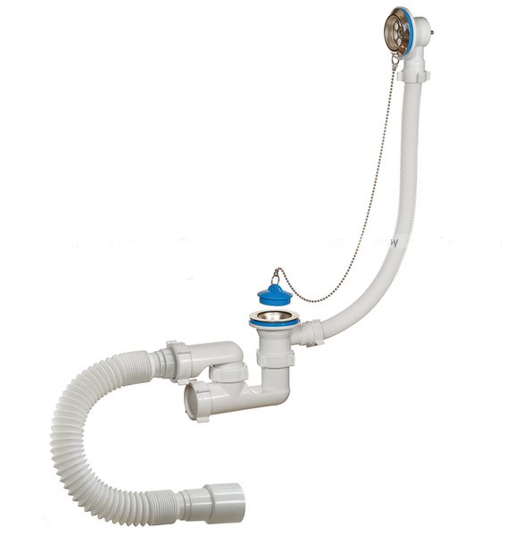 Комплектуется гофрированной трубкой длиной 750мм, с универсальным выпуском 40 ниверсальным выпуском 40/50мм и пробкой на цепочке.